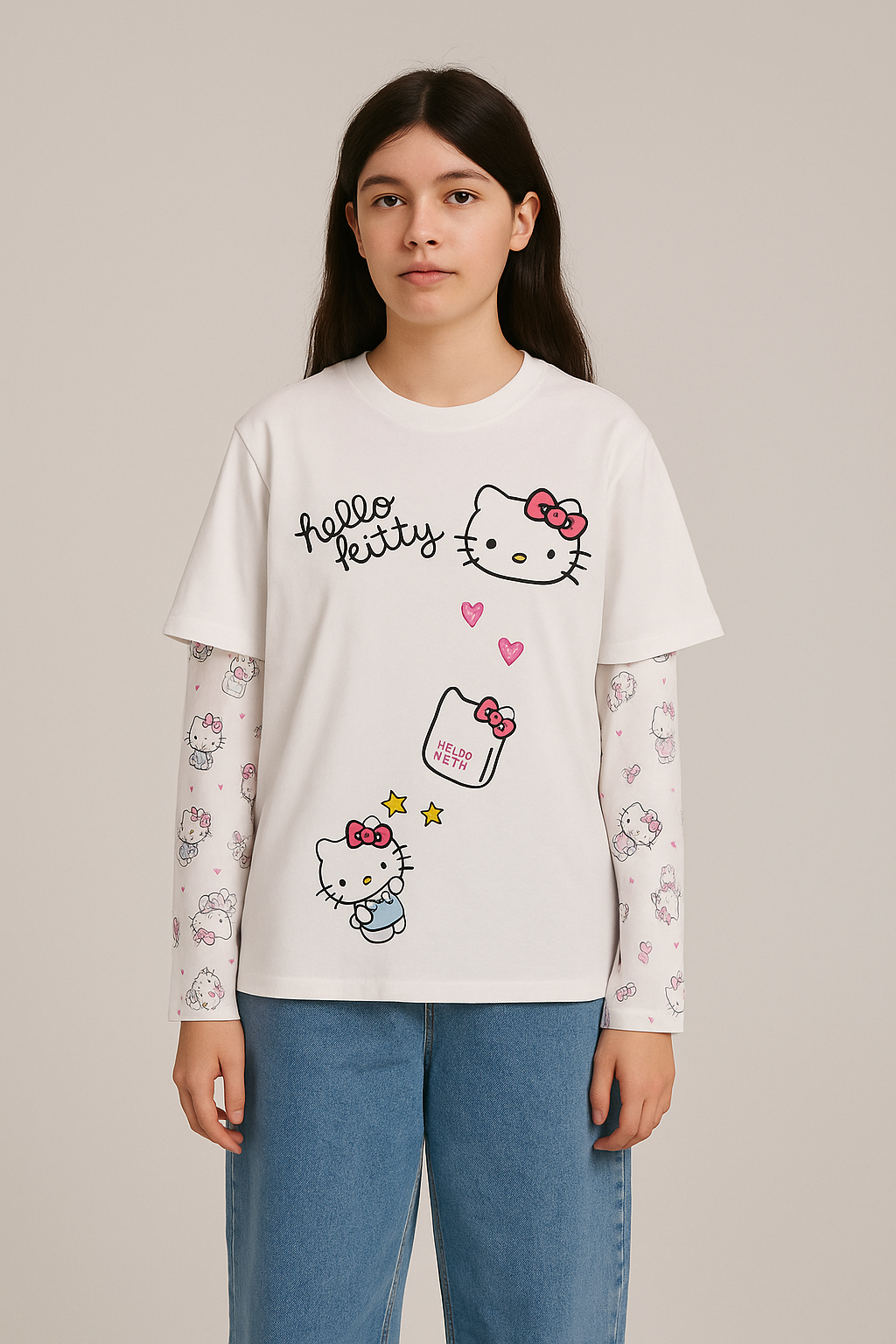 • The outer T-shirt is white with a printed Hello Kitty face, hearts, and playful stars.