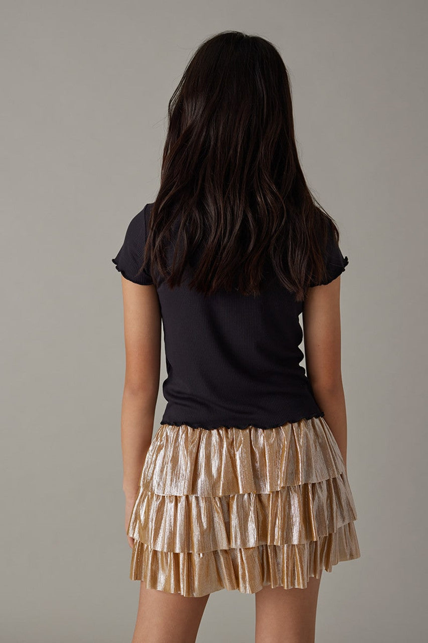 This mini skirt is featuring a tiered, ruffled design. It has a high-waisted, smocked (elasticized) waistband that provides a comfortable fit and adds texture to the top. The fabric has a pleated, glossy finish that reflects light, giving the skirt a playful and glamorous look. This outfit combines edgy and feminine elements for a trendy, modern aesthetic.