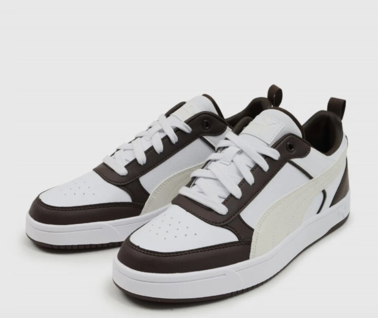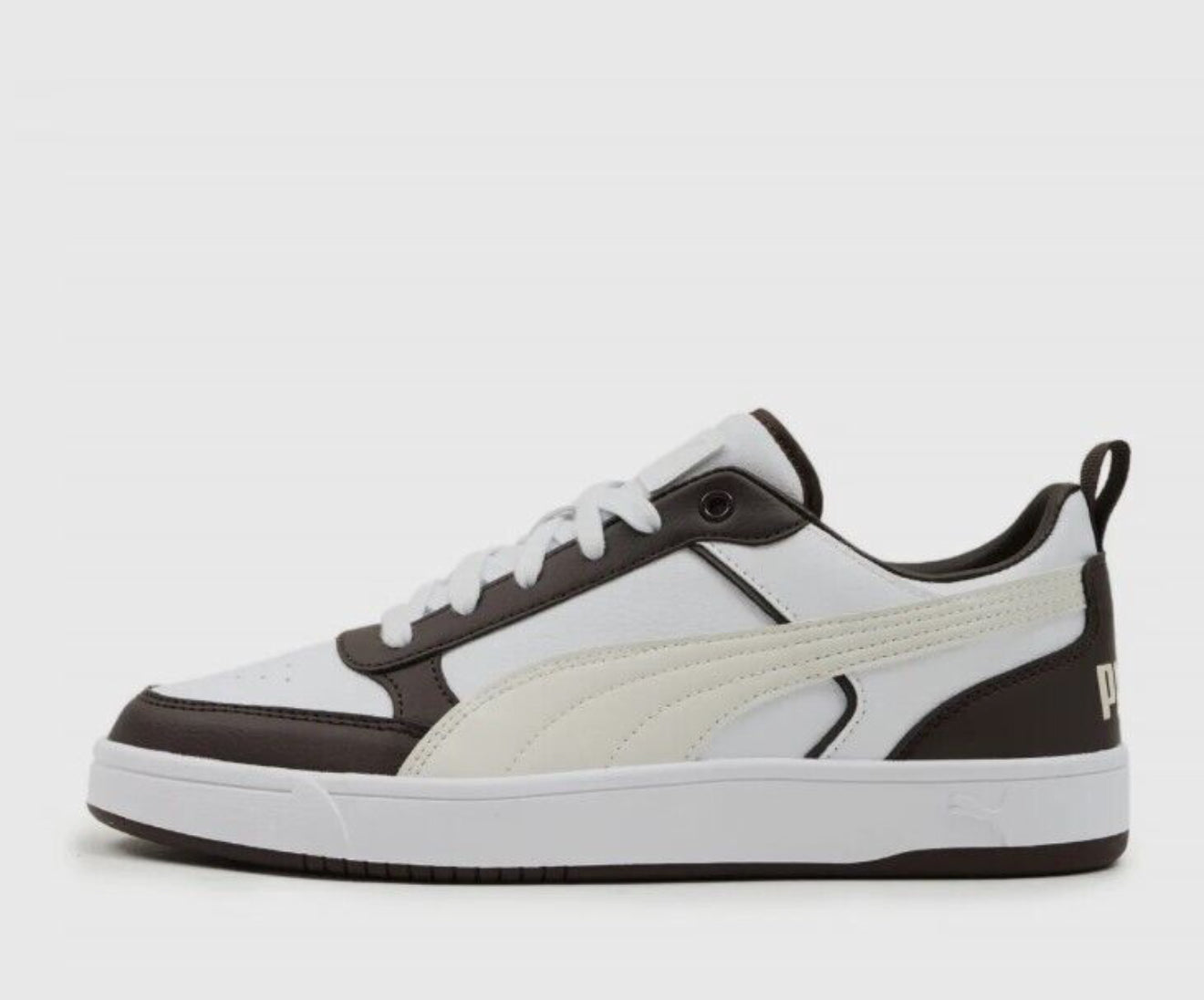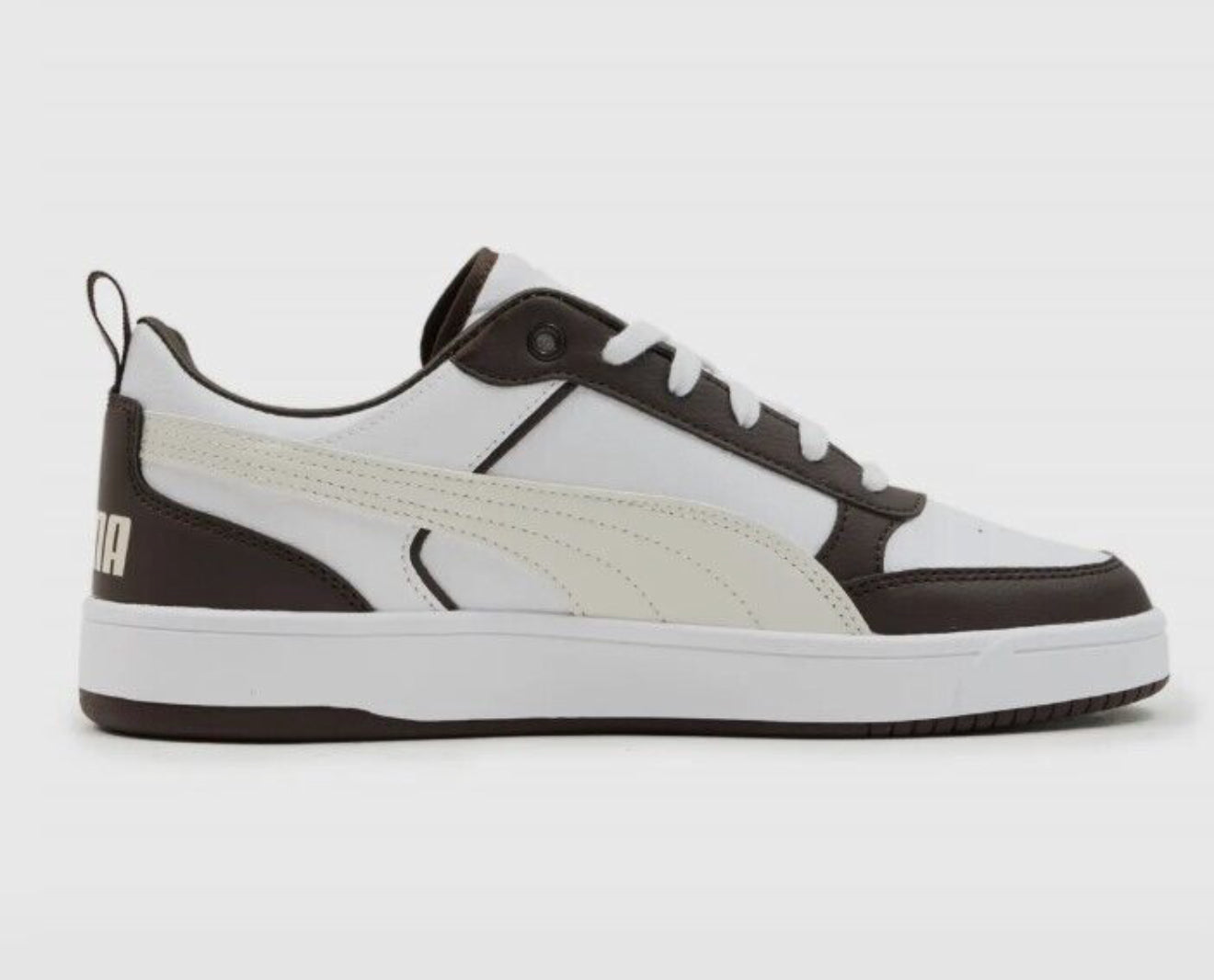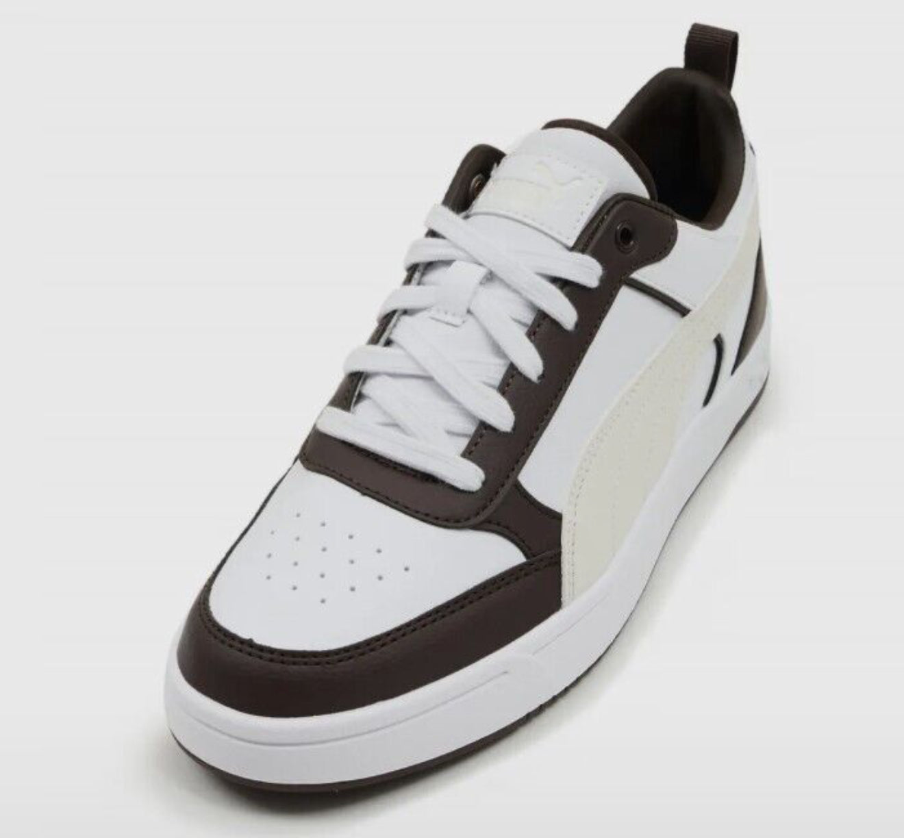 This is a stylish pair of low-top sneakers designed by PUMA. The shoes feature a sleek combination of white, dark brown, and off-white/cream tones.